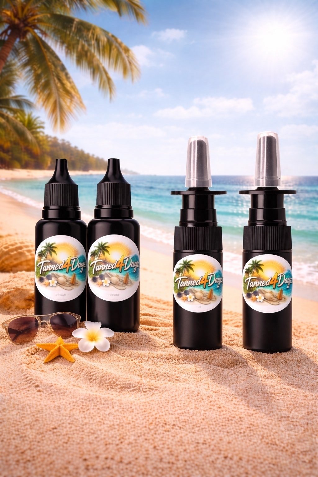 Level up your tanning routine with the Tanned4dayz double glow bundle - a powerful combination designed to help you achieve a deeper, darker, and more Even tan with ease. Featuring both our advanced nasal spray and signature tanning drops, this bundle gives everything you need for maximum glow results.
